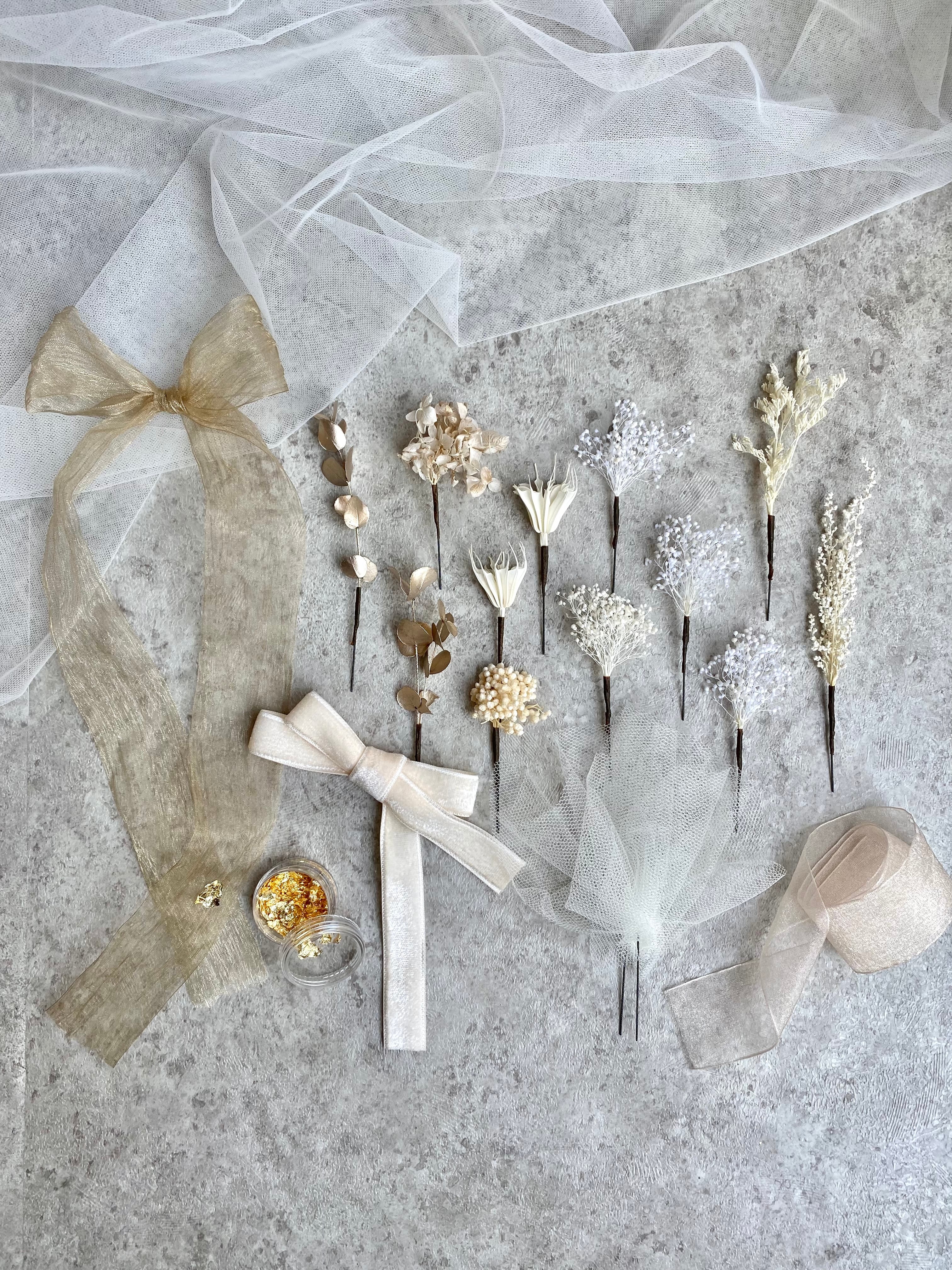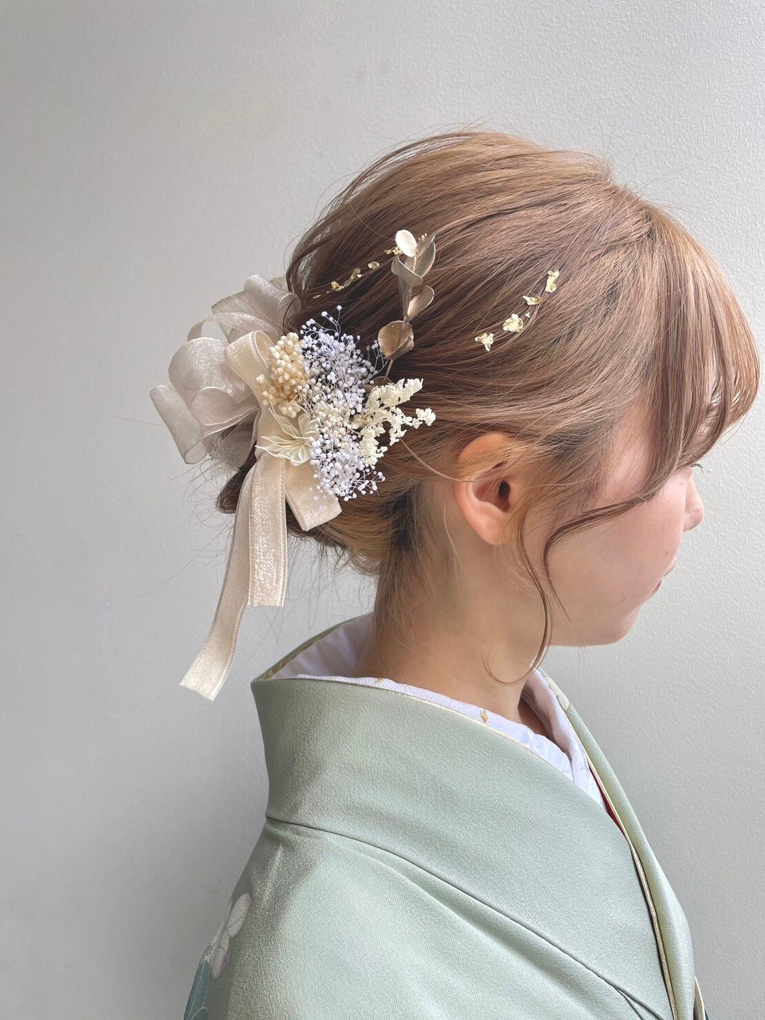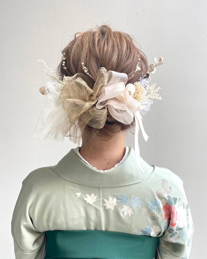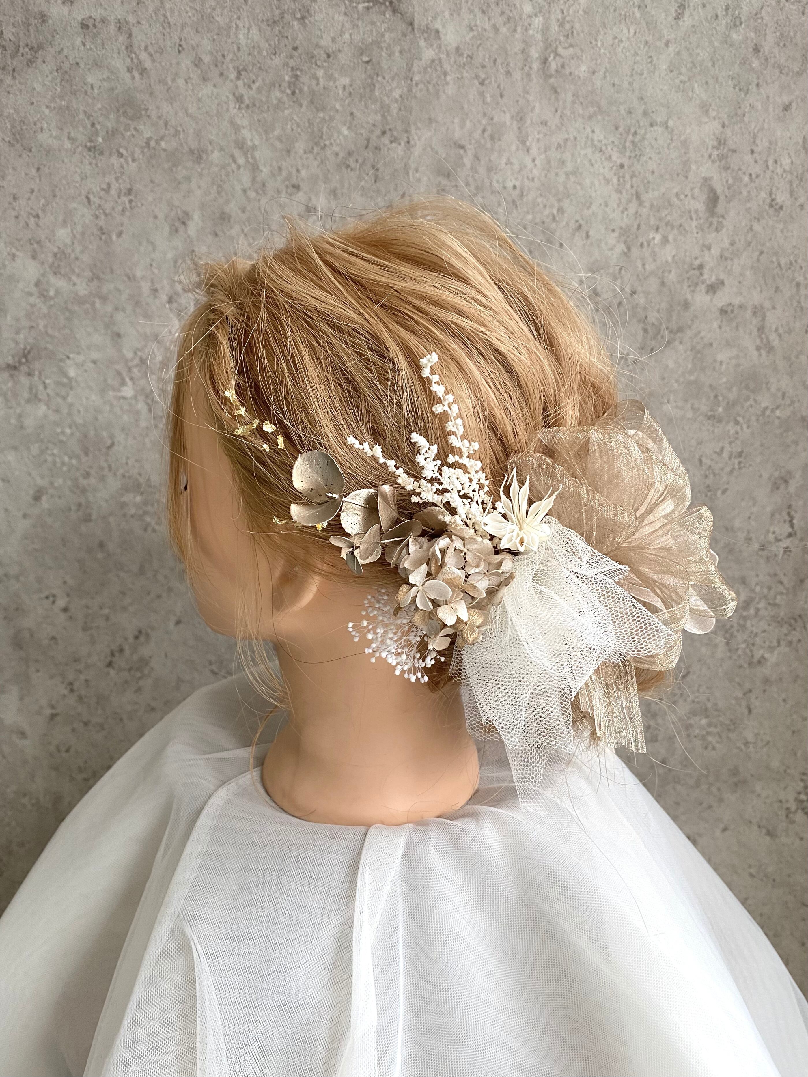 透けるオーガンジーリボン、繊細なドライフラワーなどを淡い色味で柔らかく組み合わせました♡